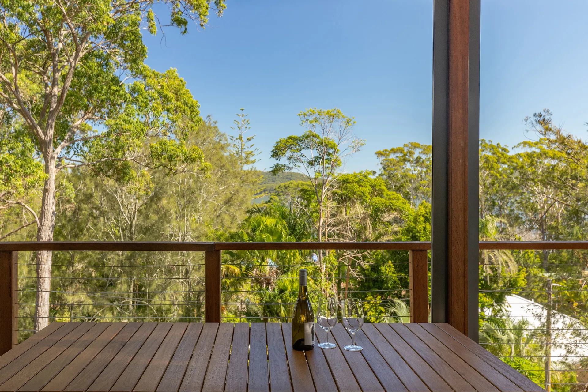 Sitting in the tree tops overlooking Smiths Lake, is this modern light and bright holiday home.