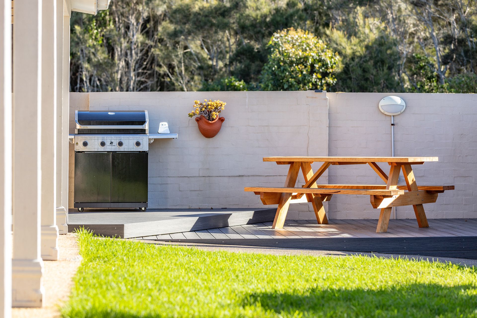 The sunny private deck and enclosed garden are an entertainers dream, with plenty of outdoor seating, a large cantilever umbrella and gas BBQ. This is the perfect area to sit back and enjoy the sea breeze while watching the children play on the lawn in the securely fenced ultra private yard.