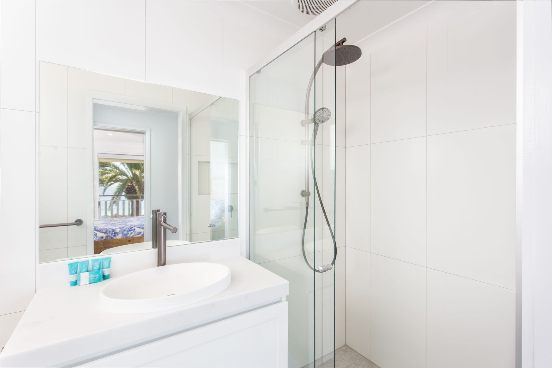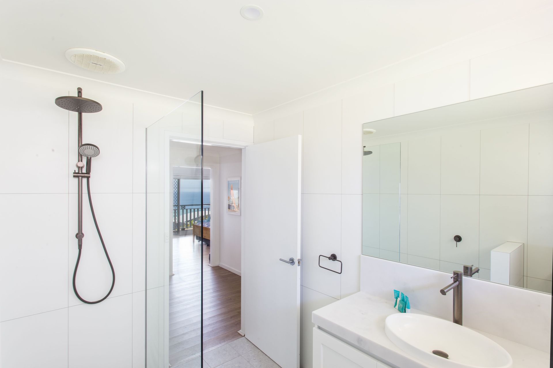 On the upper level, at the heart of this family home, is the spacious open plan living and dining area with large glass doors opening onto the ocean view, filling the house with fresh coastal air. Bedroom one has access to the ocean balcony features a comfortable queen bed, TV and ensuite bathroom and bedrooms two and three with a queen and double bed respectively, with adjoining family bathroom.