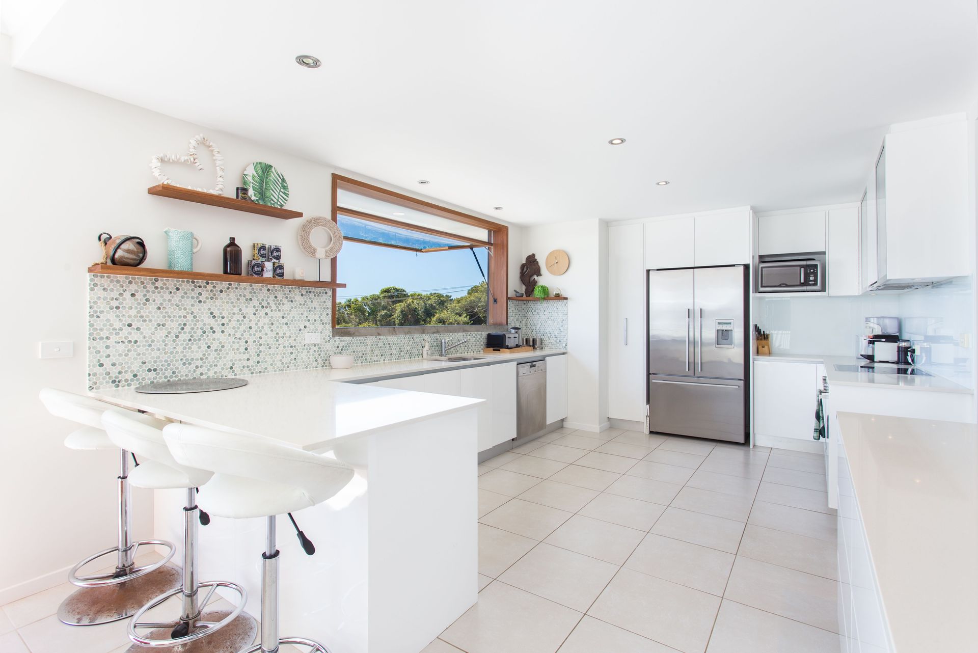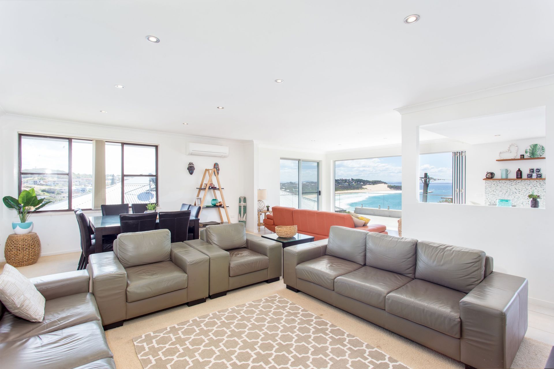 The open plan living, dining, and kitchen area is the very heart of this coastal home, with floor to ceiling glass doors that open up to the spacious deck to take in the view and draw in the ocean breezes. Set up with four bedrooms, two bathrooms, and two loungerooms across the two floors, there is room for everyone and with large tiles throughout and carpet in the bedrooms, you will find the right balance between keeping cool and comfortable.