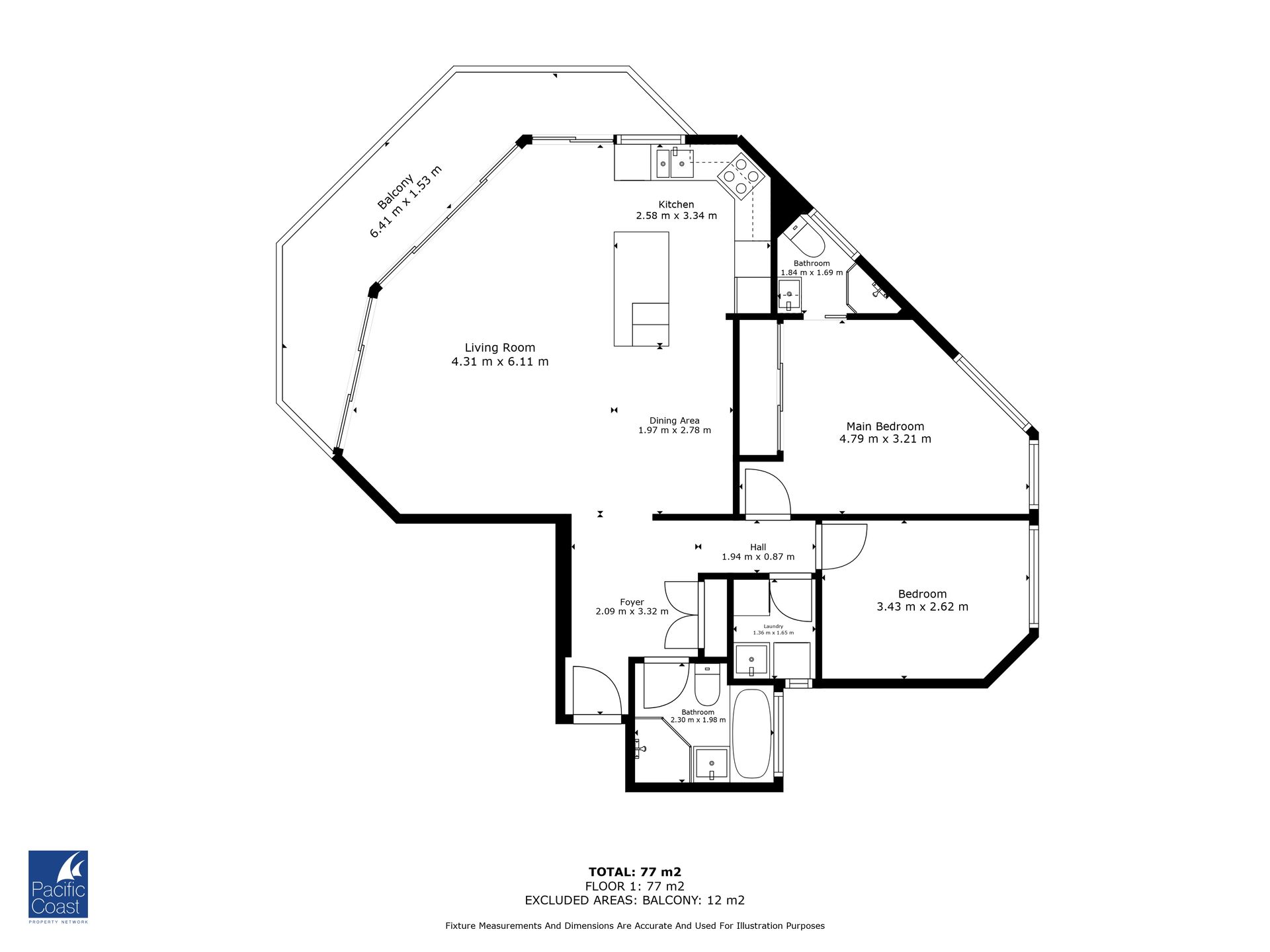 The tiled open plan living/dining area with heated flooring has mirrored feature wall, curves around making the very most of the beautiful water views. Large sliding doors open onto the balcony to best soak up the views.