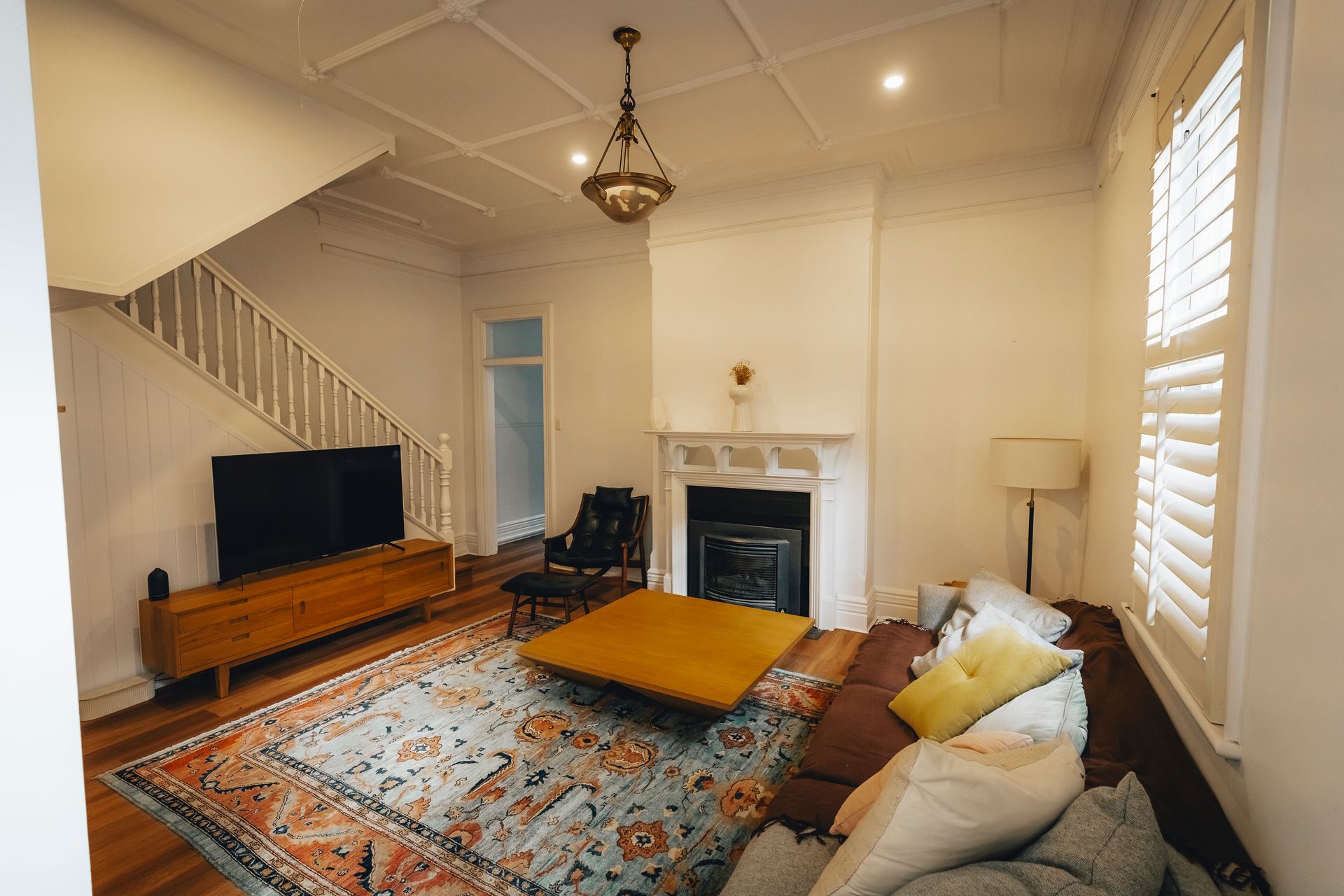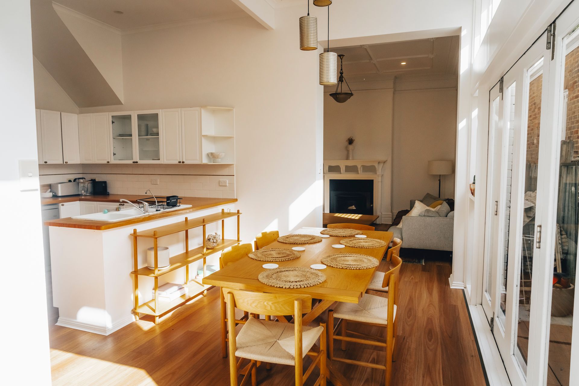 The lower level offers original finishes, beautiful high ceilings and a fireplace. The living room flows through to the dining and kitchen space where there is plenty of room to cook up a storm after a day of exploring – or enjoy a glass of wine and a BBQ in the outdoor courtyard under the festoon garden lights, a very special space at night. With an abundance of outdoor space to be enjoyed this private sanctuary feels like an oasis hidden amongst the bustling streets of Manly. Once you step in inside you are transported back in time yet surrounded by modern luxuries like air conditioning in all the bedrooms and newly renovated bathrooms. Lostris Manly offers plenty of space for families, couples or friends to relax and enjoy together.