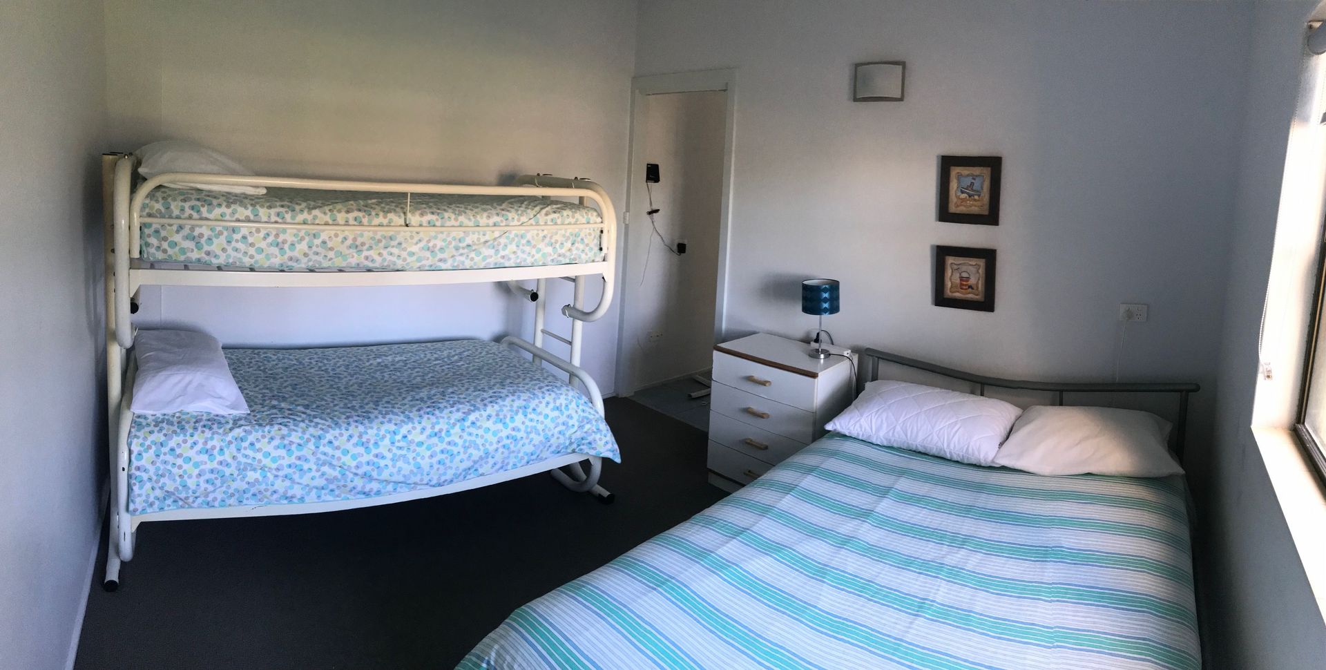 Bedroom one is upstairs with a queen bed, the bathroom has a shower and a toilet. On the ground floor, bedroom two has a double bed, bedroom three has a queen bed and the 4th bedroom has a double bed and a bunk bed. All of the beds are made up with linens and towels for the bathrooms, you just need to bring along your own beach towels.