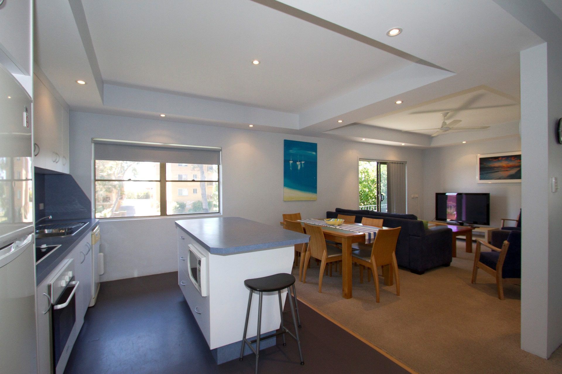 The upper level has a well equipped kitchen including dishwasher and opens onto the covered alfresco dining area with gas barbecue. The open plan living/dining area has split air conditioning system, TV, DVD and a ceiling fan. The living room opens onto the side balcony.