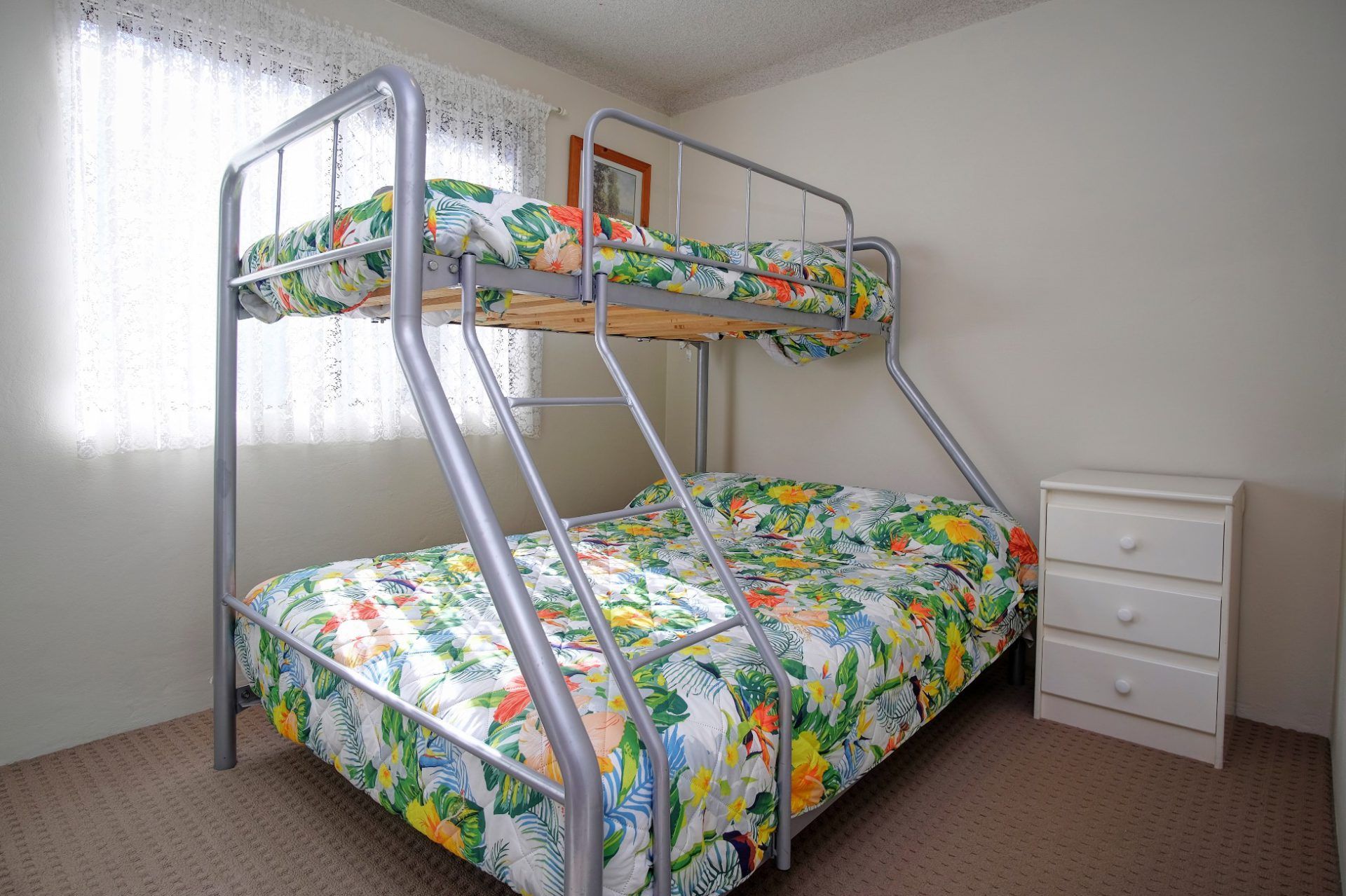 Main bedroom has a queen bed with a tri bunk (single over double) in the second bedroom - great option for two couples or a small family. The family bathroom has a bath, separate shower and toilet.