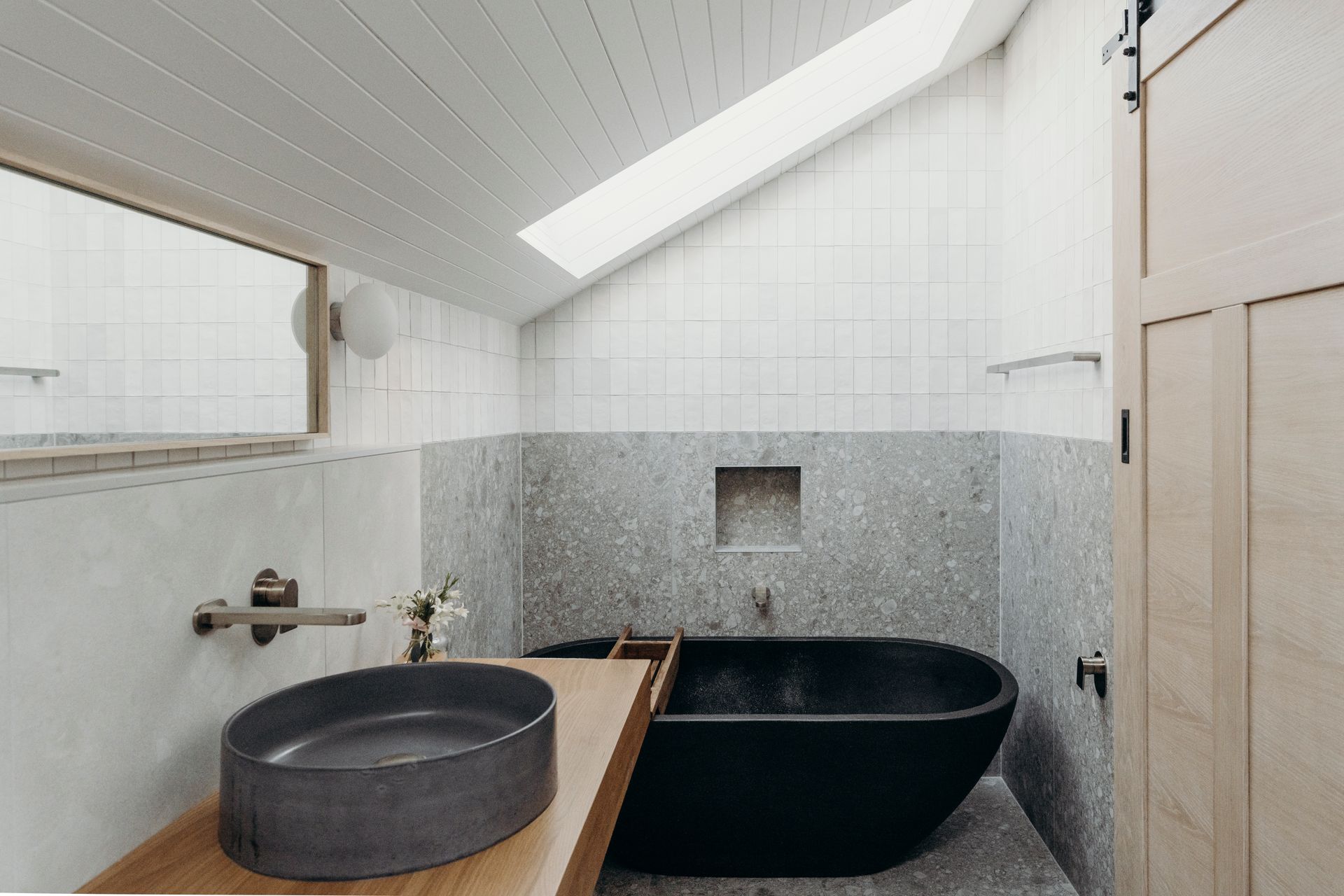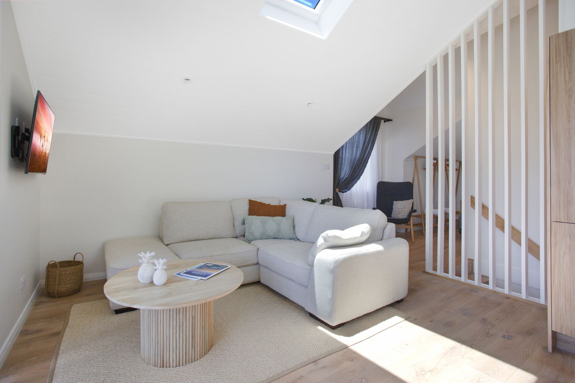 The main bedroom features a Queen size bed with opening skylight above. The immaculately appointed bathroom features a spacious bathtub, large walk-in shower and two large skylight allowing natural light to flood the room.