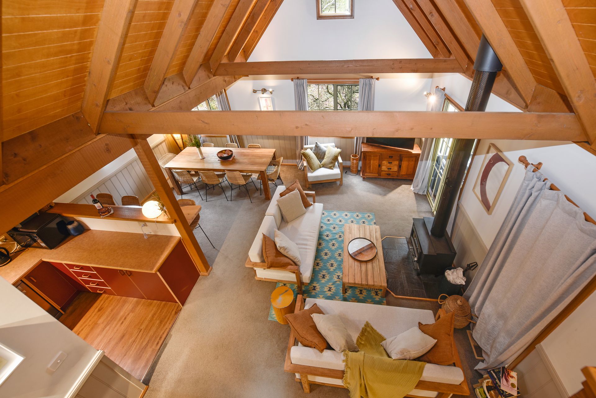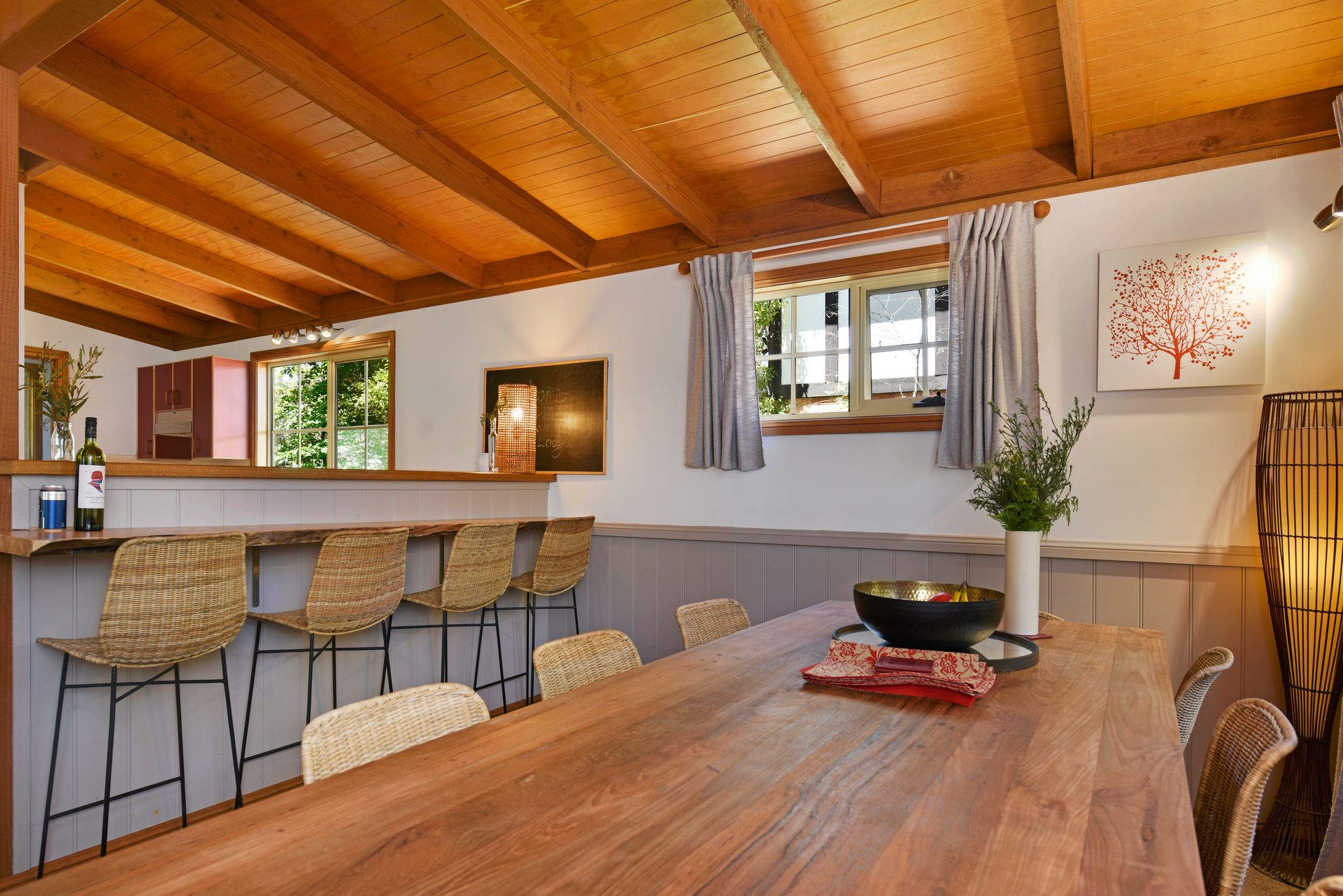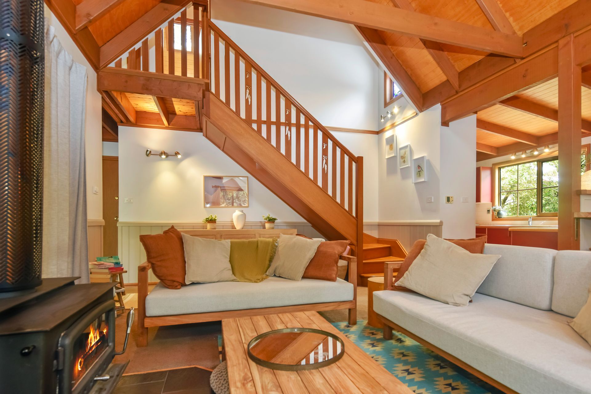 The heart of The Lodge is its self-contained kitchen. Entertain in the open plan living area and share a meal at the well-proportioned teak dining table, comfortably seating eight guests. Whether you're enjoying a drink or simply unwinding, the live edge bar is the perfect spot. On cooler nights, you'll find cozy comfort by the slow combustion fireplace, or switch on the natural gas central heating to keep warm. As the sun sets, savor the moment on the balcony while you fire up the B B Q and watch the sky transform into a canvas of colors. For those who need to stay connected or want to catch up on work, a workstation with a monitor is thoughtfully provided.